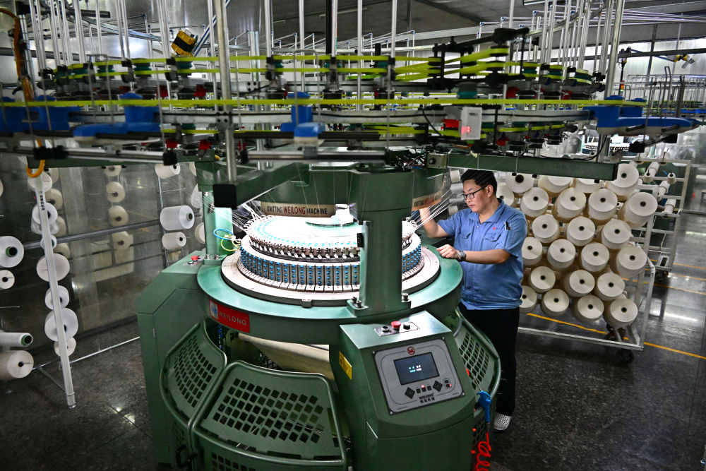 2025年3月25日,山东省青岛市即墨区一家智慧纺纱企业的技术人员在维护生产高档布料的自动化圆机。近年来,即墨区引导民营企业加大新技术、新装备、新工艺的研发和投入,加快信息化和工业化融合升级改造。同时,通过对接企业用工需求、实施新技能培训等举措,促进纺织服装产业可持续高质量发展,也让群众在家门口实现稳定就业和增收。