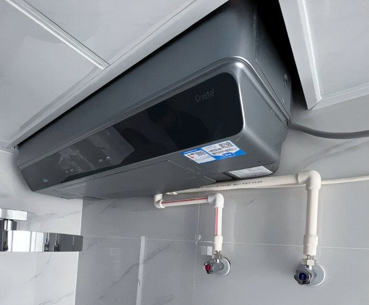 想要解决这个问题其实非常简单,只需要采用半嵌入式的设计,就能释放空间了,这样热水器只有一半是显露出来的,剩下的就嵌入在了吊顶中。