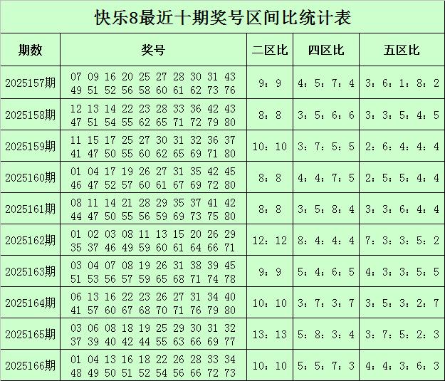 福彩快乐8第2025166期开奖回顾:01 04 13 16 18 22 26 28 33 34 48 49 50 51 52 54 56 66 72 73,其中奖号二区比为10:10,四区比为5:5:7:3,五区比为4:4:3:6:3,除2余数比为6:14,除4余数比为7:5:7:1,除5余数比为1:6:3:6:4。