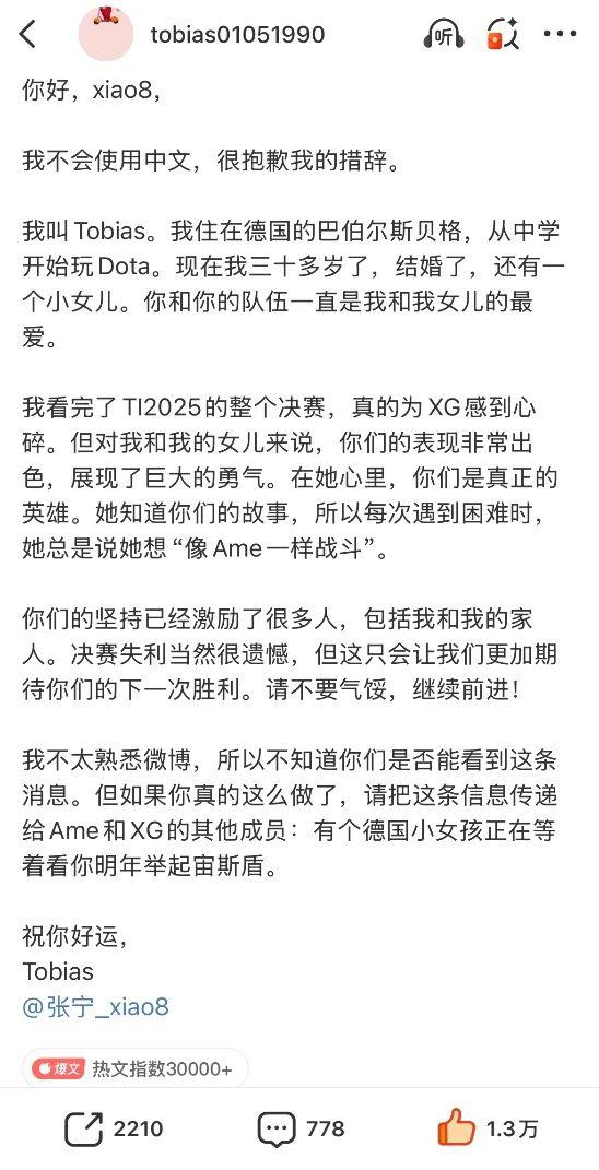 在 xg 于决赛上 2:3 负于 falcons 的一周后,一位自称德国 dota2 玩家的用户,用机翻中文在微博上写了封鼓励信 @了 xg 教练 xiao8,"请把这条信息传递给 ame 和 xg 的其他成员:有个德国小女孩正在等着看你明年举起不朽盾"。