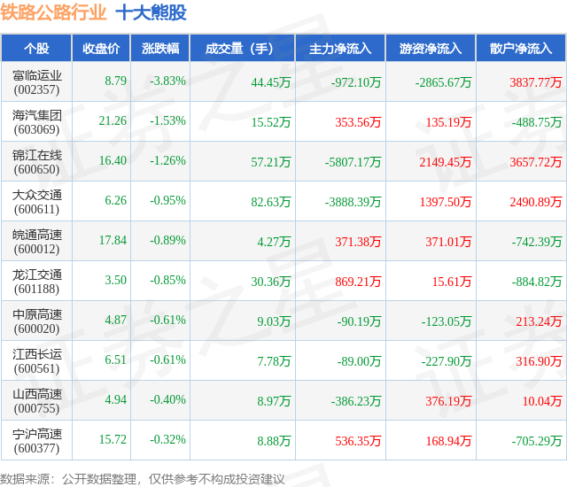 个股表现方面,铁路公路行业当日领跌股为富临运业(002357),该股当日报收8.79,下跌3.83%,成交量44.45万,主力资金净流出972.1万元。海汽集团(603069)以下跌1.53%紧随其后,该股当日成交量15.52万,主力资金净流入353.56万元。除此之外,锦江在线(600650)、大众交通(600611)、皖通高速(600012)均进入当日熊股之列。具体个股列表见下表: